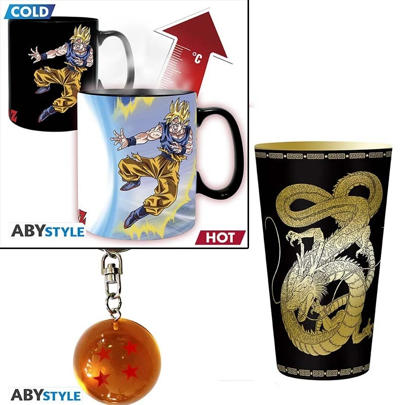 Dragon Ball Z Coffret cadeau DBZ. Faite plaisir à un fan de Dragon Ball avec ce coffret cadeau avec une magnifique illustration du Dragon shenron. le coffret contient un porte clés Boule de Crystal, un verre XXL Shenron et un mug Thermo-réactif Goku vs Buu.