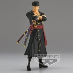 One Piece Figurine Zoro Wanokuni dans la gamme DXF Grandline men de Bandai Banpresto. Cette figurine One Piece de zoro le met en scène avec sa tenue noir et le regard typique du puissant Mugiwara!